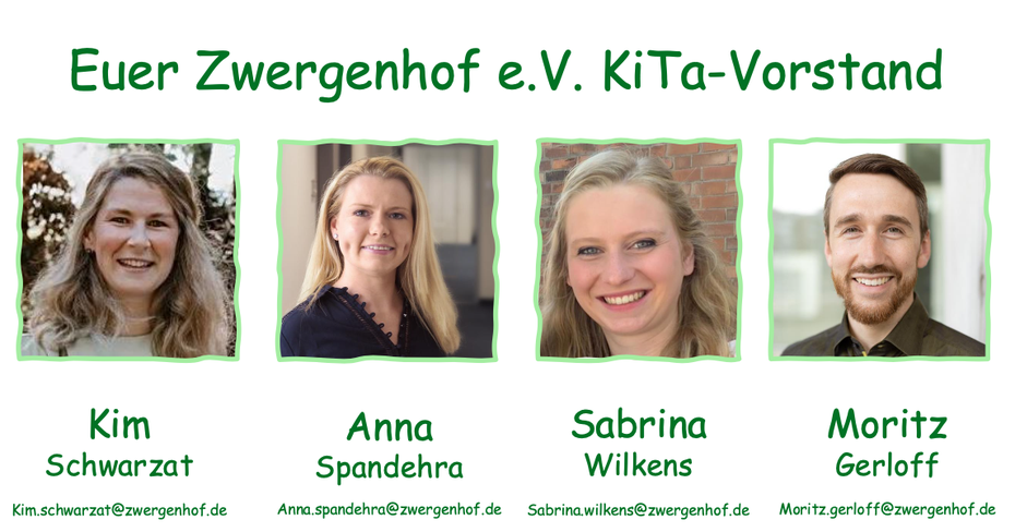 Der aktuelle Vorstand des Vereins wurde im November 2024 im Rahmen der Jahreshauptversammlung gewählt. Seitdem stellen wir uns den organisatorischen Aufgaben unseres Kindergartens. Wir verstehen uns als Interessenvertreter aller Vereinsmitglieder, die überwiegend Eltern sind, deren Kinder im Zwergenhof betreut werden oder wurden. Daher zielt unsere Arbeit immer darauf ab, die Kindertagesstätte zum Wohle unserer Kinder und unserer Mitarbeiterinnen sowohl traditionsbewusst als auch zeitgemäß weiter zu betreiben und zu entwickeln.
